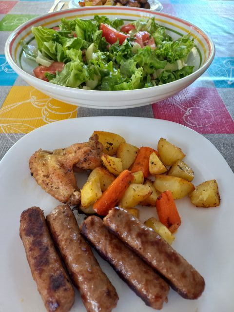 Pečen krompir, perutničke, čevapčiči; mešana solata; pecivo