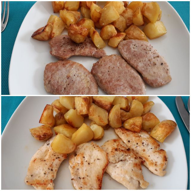 Včeraj sem spekla čevapčiče, v pečici krompir in perutničke, paradižnikova in kumarična solata, čebula. Slikat pozabila. Bil je vroč soparen dan.