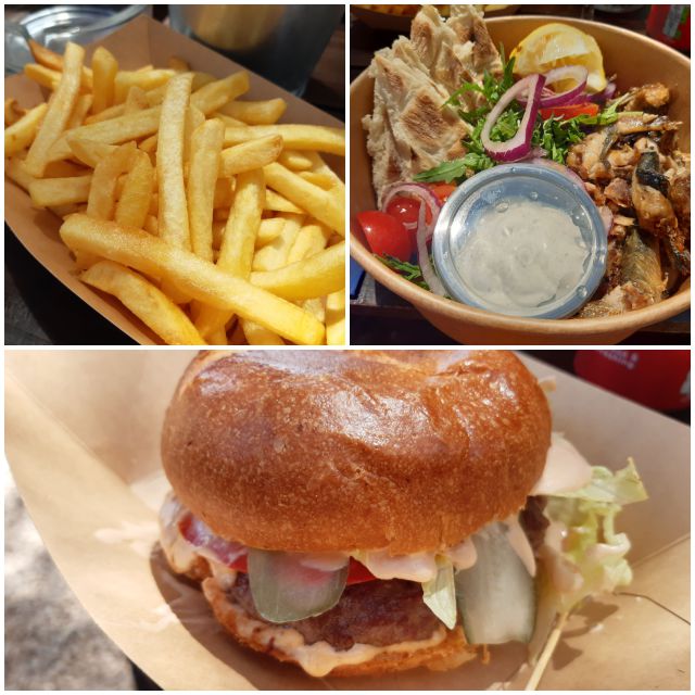Danes neka brzinskega za pojest na plaži- hamurgerji, pomfri, jaz skledico s sardinami, solato, popečenimi kruhki in tatarsko omako. Dobro je bilo.