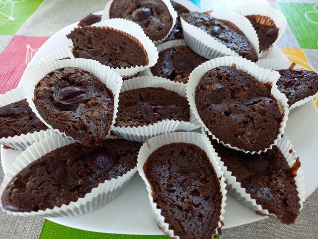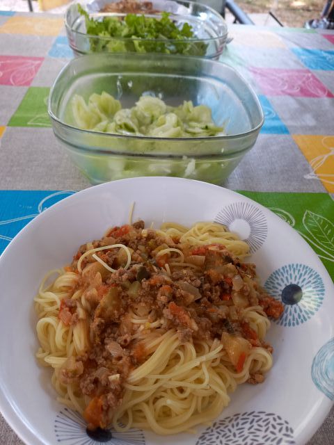 Špageti a`la bologneze; kumarična in zelena solata; čokoladni mafini (malček so se razlezli)