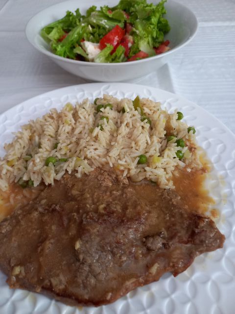 Goveji zrezek v naravni omaki, rizi bizi; mešana solata