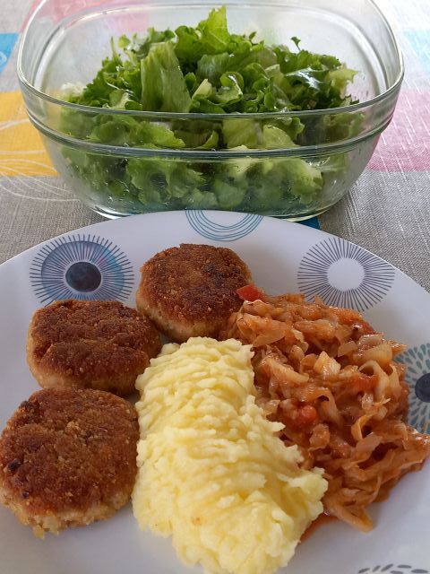 Prisiljeno zelje, pire krompir, faširanci; zelena solata; lubenica