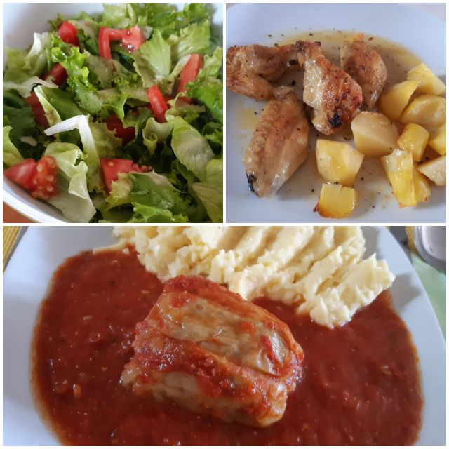 Včeraj polnjene paprike iz zaloge, pire krompir, pečene perutničke, krompir, solata