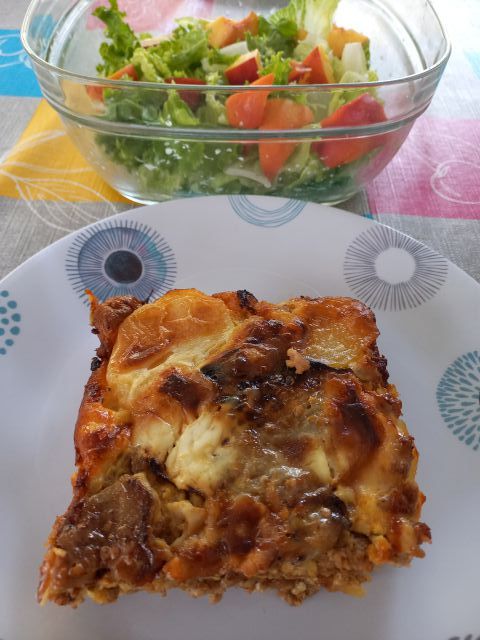 Musaka - krompir in popečeni malancani; zelena solata, nektarine