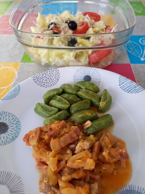 Juhica; Zeleni njoki, sv.meso v omaki; zelje, paprika in paradižnik na solato