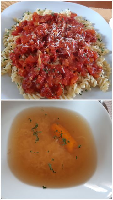 Danes jaz samo juho, fanta sta si sama pripravila kosilo z omakami iz zaloge- sin svedrčke s paradižnikovo, mož špagete z bolognese omako in paradižnikovo solato.