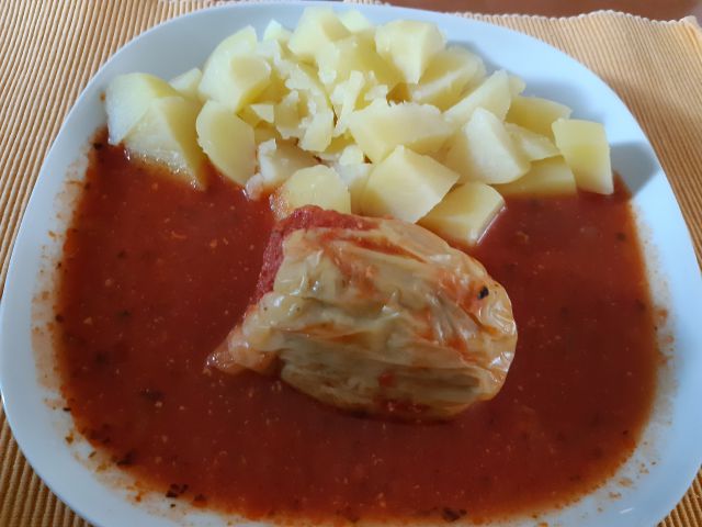 Sin polnjeno papriko iz zaloge, v kosih krompir ( samo ena je še bila), mož pol kranjske klobase, v kosih krompir, kislo zelje v solati.