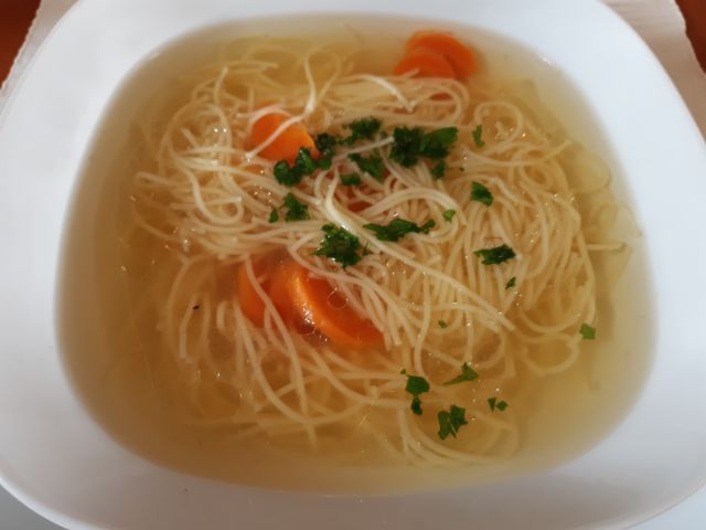 Včeraj za kosilo goveja juha z rezanci, mesno- zelenjavna rižota, rdeča pesa. Slikala sem le juho.