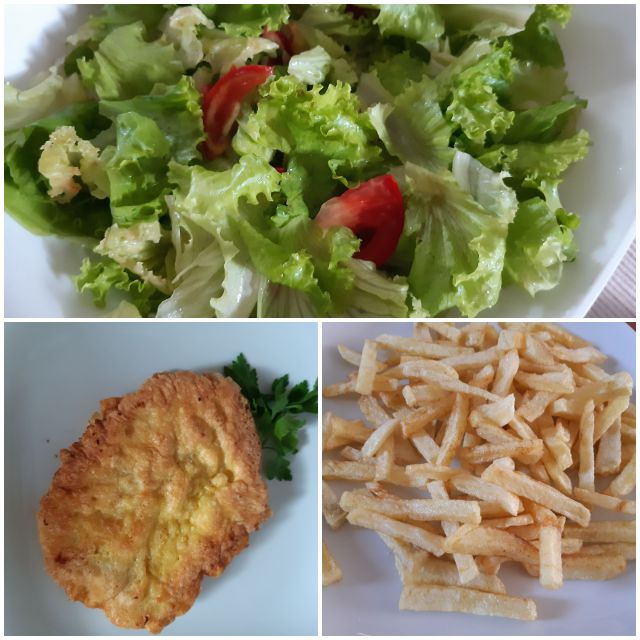 Danes pariški zrezek, pomfrit in zelena solata z domačim paradižnikom. In