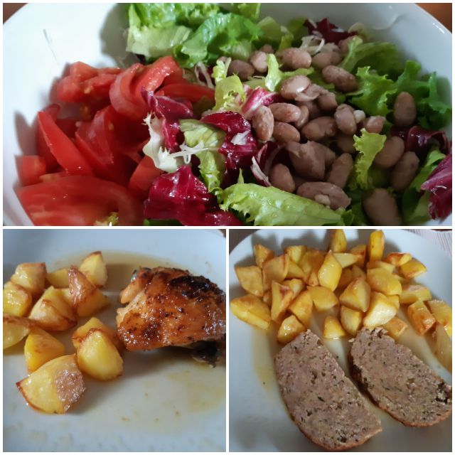 Danes na željo sina za začetek šolskega leta- mesna pečenka, zame piščanec, pečen krompir, mešana solata