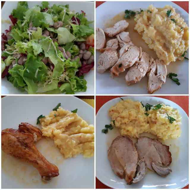 Včeraj pečeni kosi piščanca, odojek, pražen krompir, solata