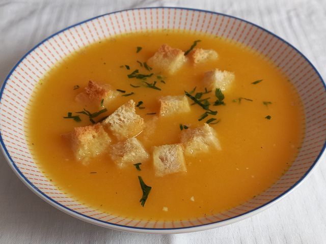 Bučkina juha, brancin iz pečice, masleni krompir, stročji fižol v solati, vanilijev puding s svežimi borovnicami
