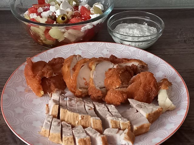 Porovo-korenčkova juhica; pohanje in rebra od včeraj, grška solata, omakica (majoneza, kis.smetana, kumarice)