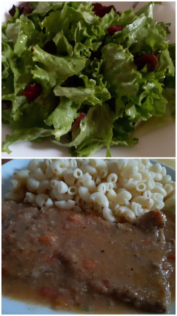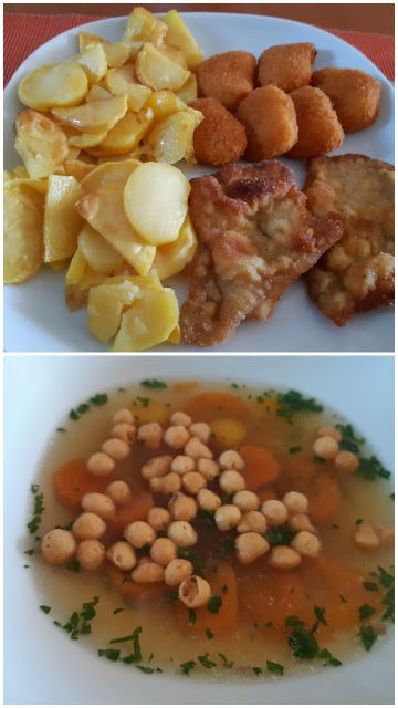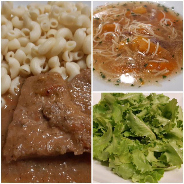 Goveja juhica; pečene perutničke s krompirjem; zelena solata
