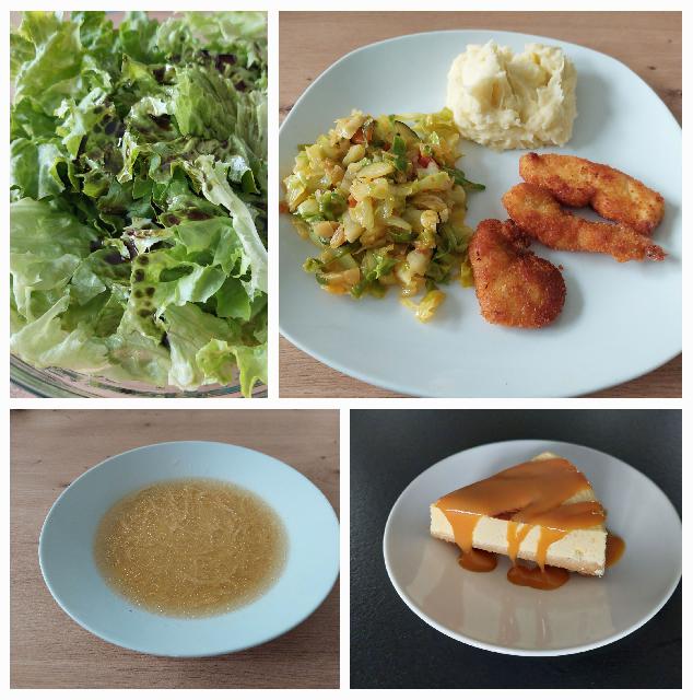 Goveja juha z rezanci iz zaloge, pire krompir, dušeno mlado zelje z bučkami in češnjevcem, pohančki, zelena solata in cheescake s karamelo: