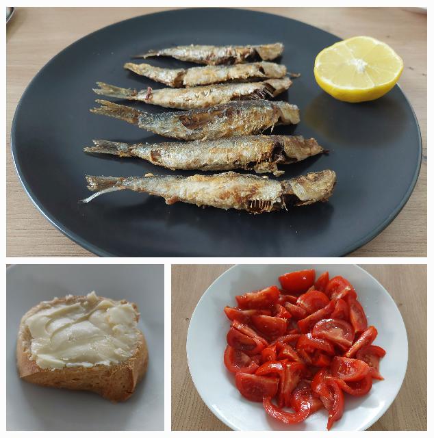 Danes sva sama z možem, zato obvezno ribe - tokrat ocvrte sardelce, paradižnik, kruh s česnovim maslom: