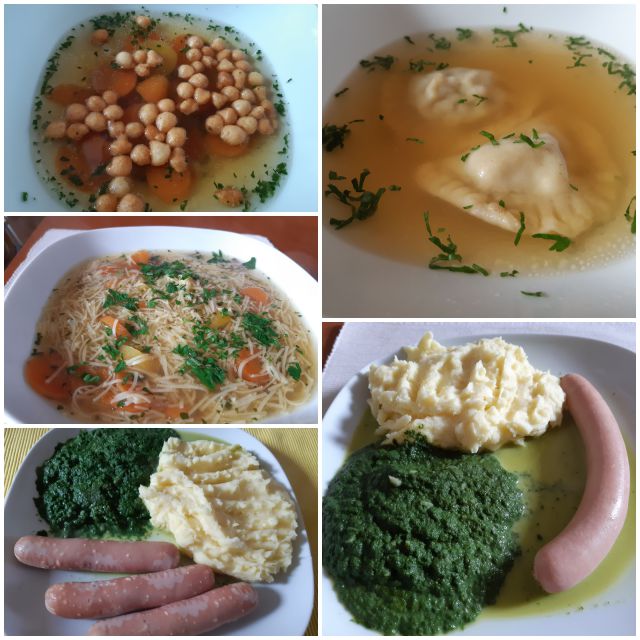 Danes kokošja juha z žlinkrofi, za sina goveja z zlatimi kroglicami, za moža z rezanci, špinača, pire krompir, piščančje hrenovke s sirom, navadne.