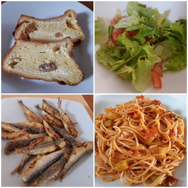 Danes testenine z zelenjavno omako in čilijem, zame sardoni, solata, skutina potica