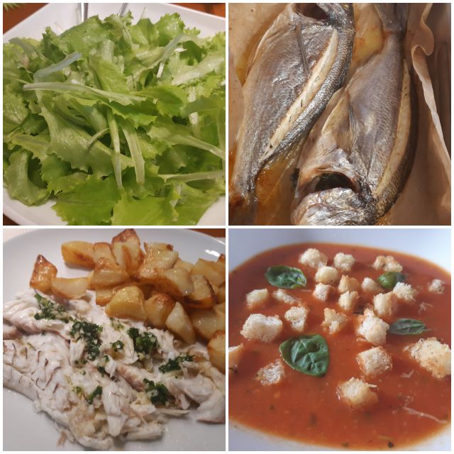 Danes paradižnikova juha s krutoni, pečeni kornatski oradi, pečen krompir, tržaška omaka, berivka, skutin zavitek
