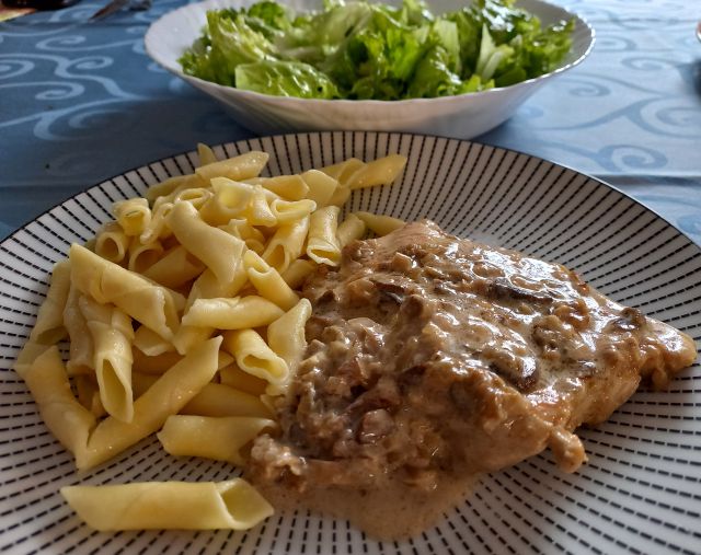 Istrski fuži, puranji zrezek v gobovi omaki; zelena solata