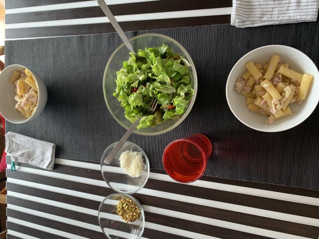 Danes je skuhal mož: testenine s tuno, parmezanom in pistacijami, solata (na sliki se ne vidi dobro, ker je ravno premešana, ampak poleg zelene je bil noter še brstični ohrovt, češnjev in sušen paradižnik, olive, mocarela ... njam!)