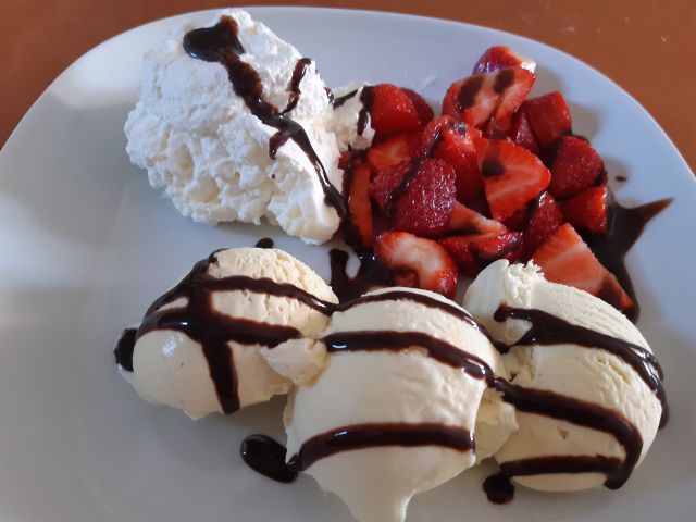 Danes segedin, kruh. Za sladico sladoled s smetano in jagodami.