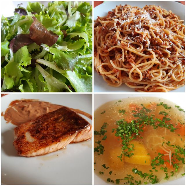 Danes goveja juha z rezanci, špageti z bolonjsko omako, zame losos, berivka