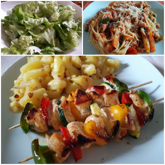 Včeraj zelenjavna omaka s špageti za enega, piščančja nabodala, pražen krompir, zelena solata