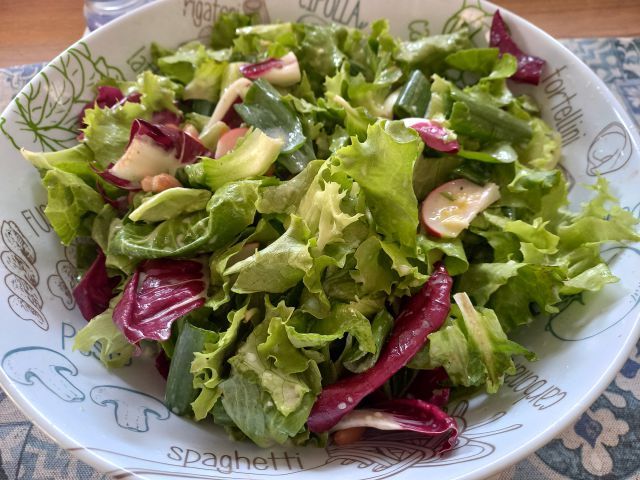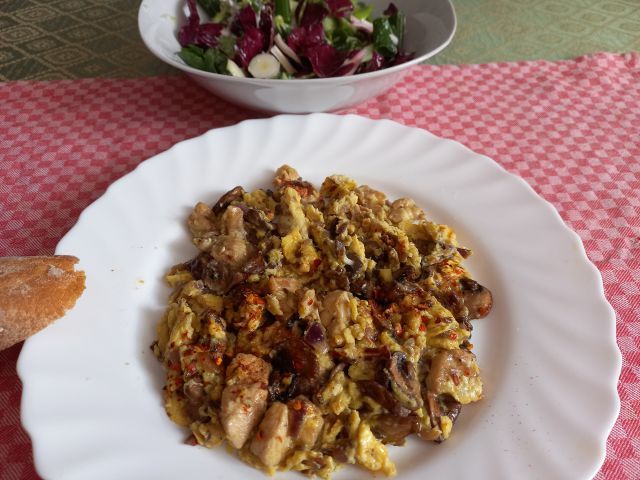 Brzinsko kosilo... piščančji trakci, šampinjoni, jajca; mešan radič z mlado čebulo