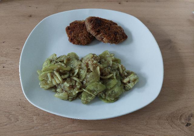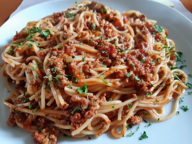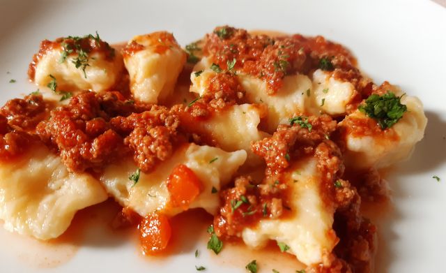 Danes bolognese omaka z bučno skutnimi njoki, s špageti, solata