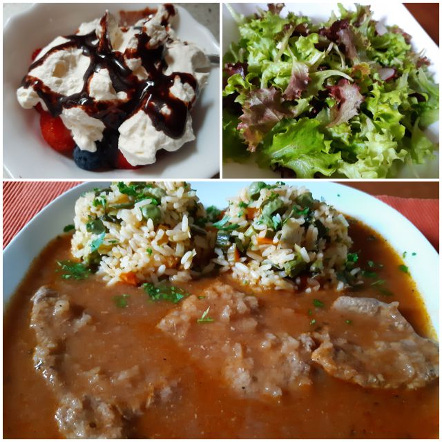 Danes telečji zrezki v omaki, zelenjavni riž, domača berivka v solati, jagode in borovnice s smetano