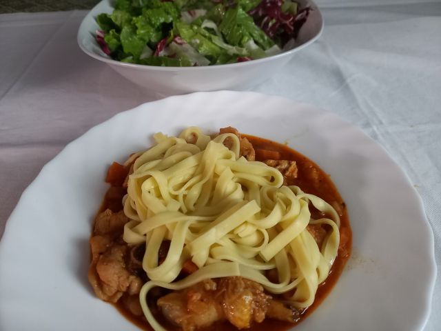 Juhica; piščančji paprikaš, široki rezanci; zelena solata in radič