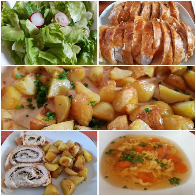 Danes goveja juha z vlivanci, svinjski zrezek in puranji zrezek v roladi, mlad pečen krompir, solata ledenka z vrta z redkvicami