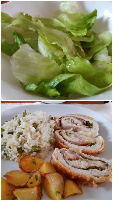 Danes preostanek pečenke, riž z beluši in grahom, ledenka solata z vrta
