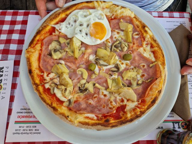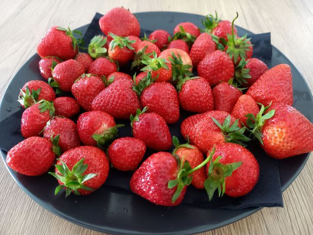 Špageti s šalšo, pršutom, česnom... podlito z vinom; zelena solata; danes odprta zelenjavna trgovinica... posledično spet jagode.
