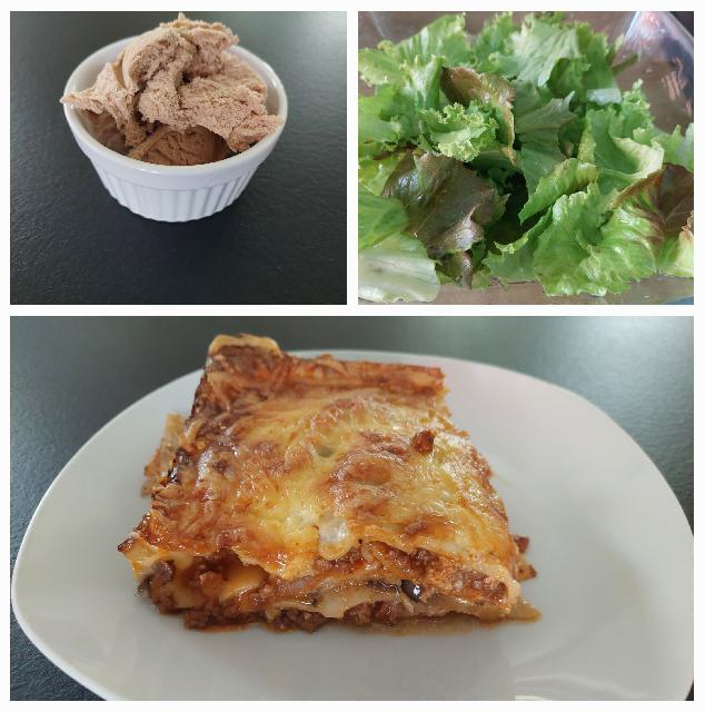 Lazanja, zelena solata z jajci in sladoled okus arašid:
