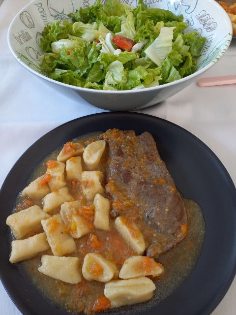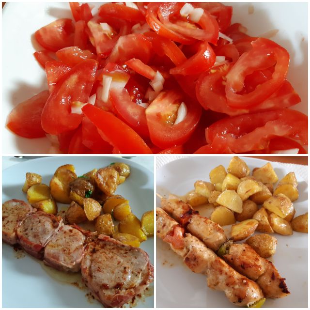 Včeraj nabodala, mlad pečen krompir, paradižnikova solata.
