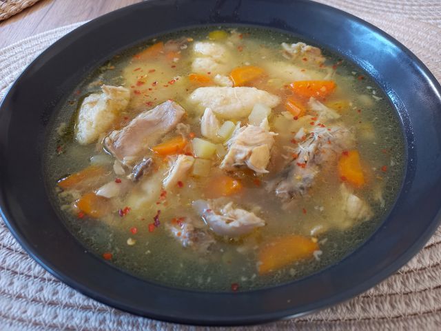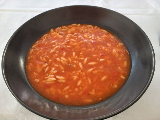 Paradižnikova juhica z rizoni; panirane perutničke, krompirjeva solata