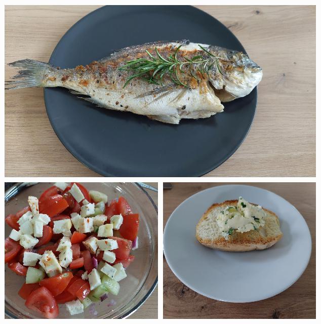 - pečene orade, sobska solata, popečen kruh z zeliščnim maslom: