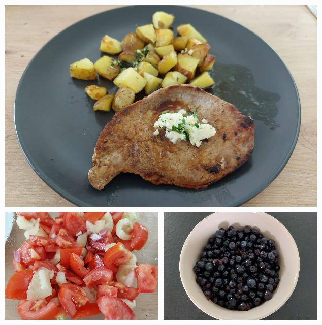 - zrezki z zeliščnim maslom, hrustljav kromipr z rožmarinom, paradižnikova solata, gozdne borovnice:
