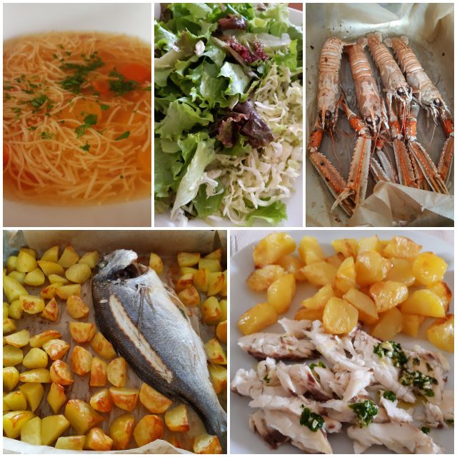 Danes goveja juha iz zaloge, pečena kornatska orada, veliki škampi, pečen krompir, zeljna solata z zeleno solato