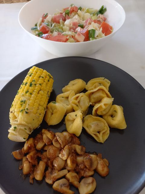 Ravioli, popečeni Šampinjoni, koruza; grška solata