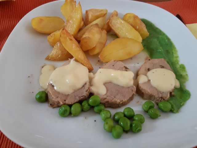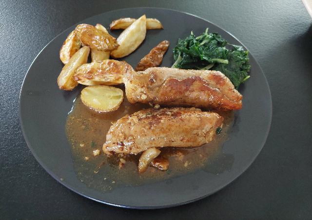 Sv.roladice s kremnim sirom, omaka od pečenja deglazirana z belim vinom, hitro dušena blitva, pečen krompir, solata: