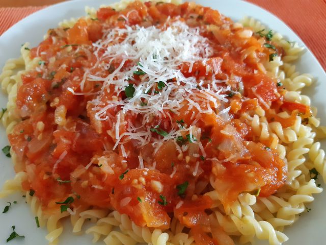 Včeraj domača paradižnikova omaka, testenine, zelena solata