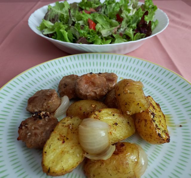 Pečen krompir, mesni ščipanci, zelena solata s paradižnikom