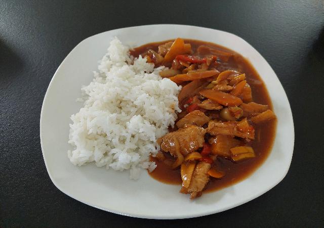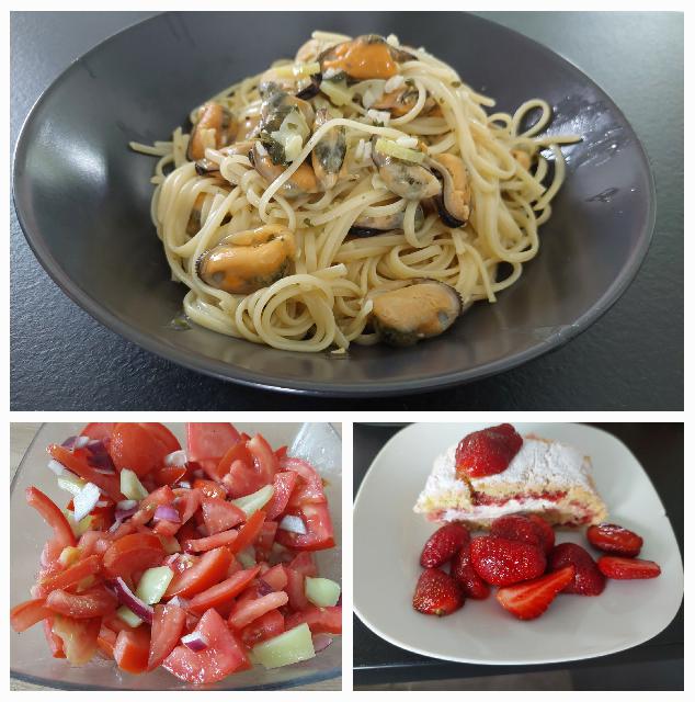 Včeraj sladko kisli piščanec in jamin riž, danes špageti na buzaro z dagnjami, paradižnikova solata in jagodna rolada: