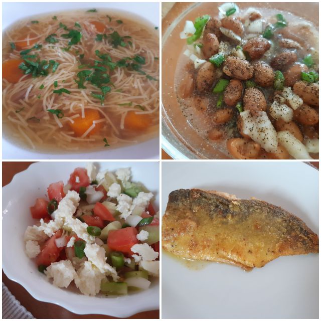 Danes potepanje v naravi in kosilo na hitro- goveja juha z rezanci, za moža hrenovka, fižolova solata, kruh. Zame file postrvi in šobska solata.