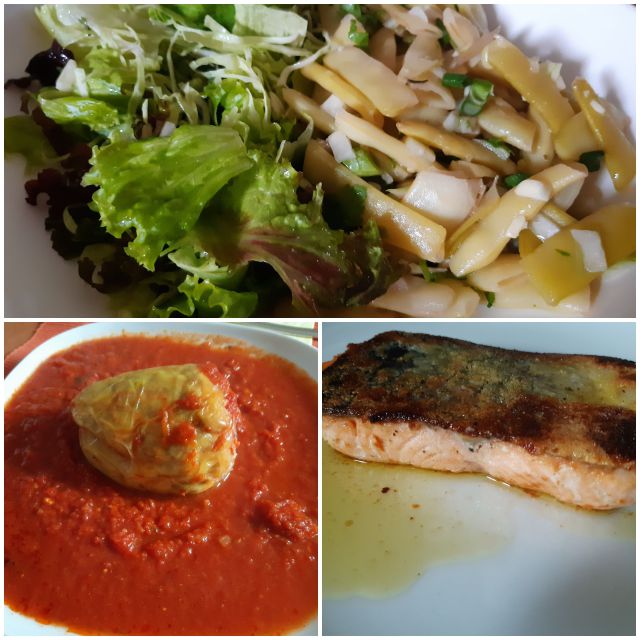 Danes za moža polnjena paprika, kruh, zame file lososa in ostanki fižola in krompirja od včeraj, solata