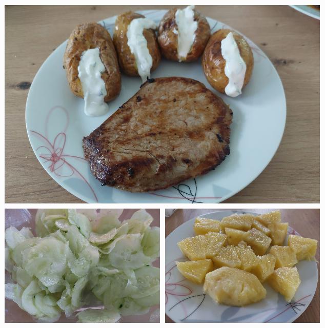 - steaki, pečen cel krompir s tzatziki omako, kumare v solati, ananas, espresso: