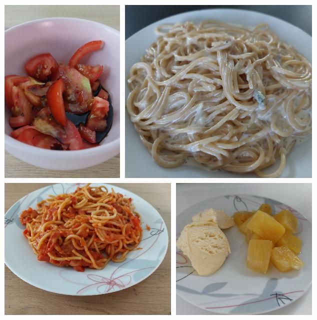 - za sina polnozrnati špageti z gorgonzolo, za naju z možem pa s paradižnikovo omako, paradižnikova solata. Sladica ananas z vanilijevem sladoledom: